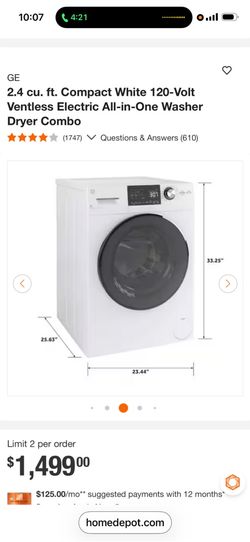 General Electric 2.4 Cu Ft Compact White 120 Volt Ventless Electric All In One Washer Dryer Combo$500Meriden, CT