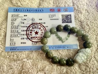 Type A Green Jade 13mm Bead Bracelet with Carved Pixiu$200Sunnyvale, CA