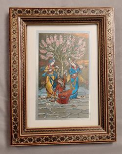 Persian Iran Hand Painted Miniature Artwork in Wood Khatam Frame Folk Art 8 in by 7 in