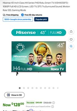 Hisense 43-Inch Class H4 Series FHD Roku Smart TV (43H4030F3) - 1080P Full HD LCD Screen, LED TV, DTS TruSurround Sound, Motion Rate 120, Gaming Mode$100Portland, OR