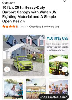 Outsunny 10 ft. x 20 ft. Heavy-Duty Carport Canopy with Water/UV Fighting Material and A Simple Open Design$120Mesa, AZ