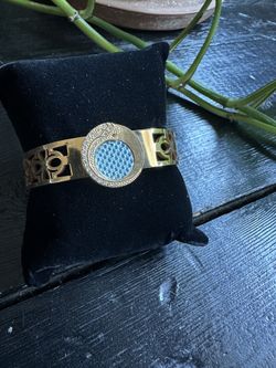 Gold bracelet with detail on cuff, circular blue and rhinestone pendant. $30Phoenix, AZ