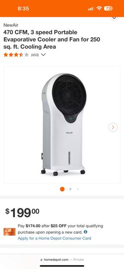 NewAir 470 CFM, 3 speed Portable Evaporative Cooler and Fan for 250 sq. ft. Cooling Area$120Las Vegas, NV