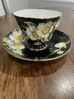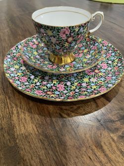 TUSCAN England Bone China MILLE FLEURS Black Chintz Set Footed Cup, Saucer and Plate$40San Diego, CA