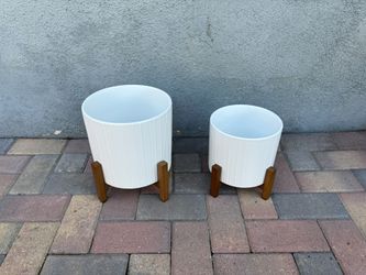 New 8 And 10 Inch Ceramic Planter Pot Set With Bamboo Wood Stand White Round - Maceta Ceramica Base Madera $75Anaheim, CA