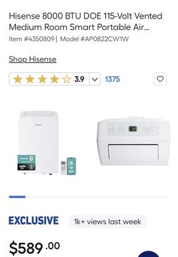 Hisense 8000 BTU DOE 115-Volt Vented Medium Room Smart Portable Air Conditioner$200New York, NY