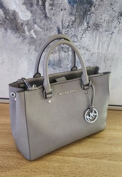 Michael Kors Medium Gray Saffiano Leather Satchel Purse with Silver-Tone Hardware and MK Charm