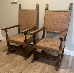 Set of 2 - 1800's Spanish Colonial Revival Walnut Carved Armchairs Covered in Fortuny Silk Fabric $1,000Los Angeles, CA