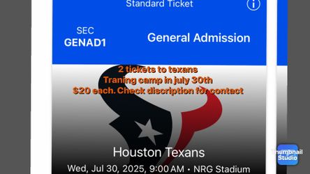 2 Tickets To Texans Training Camp$20Sugar Land, TX