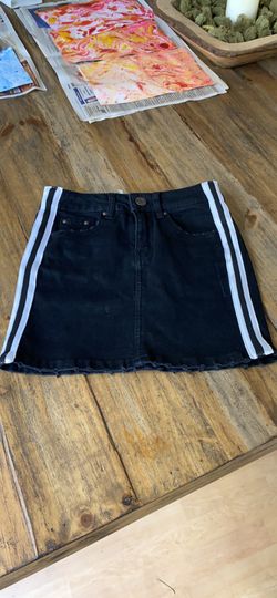 Solid black denim skirt with white stripes. Has nice stretch and pockets. Very, very cute on.$15San Diego, CA