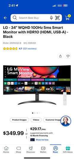 LG - 34" WQHD 100Hz 5ms Smart Monitor with HDR10 (HDMI, USB-A) - Black Model: 34SR60QC-B SKU: (contact info removed)$290Irvine, CA