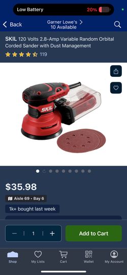 Available ^ SKIL 120 Volts 2.8-Amp Variable Random Orbital Corded Sander with Dust Management$25Willow Spring, NC