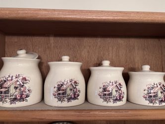 4 Stoneware Canisters Birdhouse Pink Flowers With lids$30Pompano Beach, FL