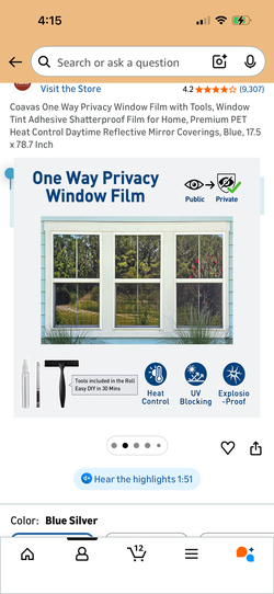 Coavas One Way Privacy Window Film with Tools, Window Tint Adhesive Shatterproof Film for Home, Premium PET Heat Control Daytime Reflective Mirror Cov$7Pompano Beach, FL