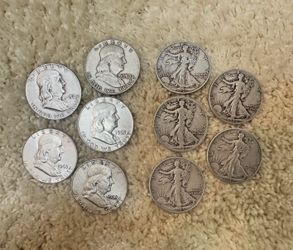 10 Silver Half Dollars Mixed Lot Walking Liberty & Franklin 90% Silver $300Worcester, MA