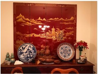 Elegant tall Chinese coromandel red lacquer 4 panel screen, embossed with gold wash paint, ancient landscaping scene.$2,500Chula Vista, CA
