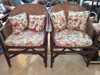 1 set of designer rattan arm chair (2 chairs) with cushions, also 1 matching side/coffee/corner table - by McGuire Furniture Company$800Chula Vista, CA