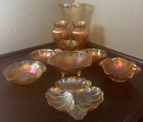 10 Pieces Vintage/antique Iridescent Marigold Carnival Glass Vases, Bowls, Dish Etc$75Cypress, TX
