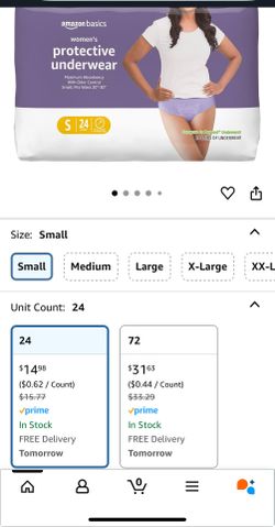 Amazon Basics Incontinence Underwear for Women, Protective, Disposable, Postpartum, Maximum Absorbency, Small, Lavender, 24 Count$8Stockton, CA