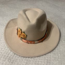 Felt Fedora Western Rodeo Hat Orange Whataburger Band & Flower Decor Brim 18x14 👉🏼one tiny flaw$15San Antonio, TX