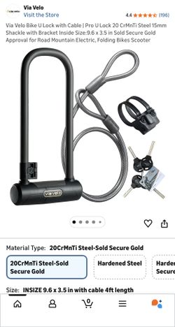 Via Velo Bike U Lock with Cable | Pro U Lock 20 CrMnTi Steel 15mm Shackle with Bracket Inside Size:9.6 x 3.5 in Sold Secure Gold Approval for Road Mou$50Rancho Cucamonga, CA