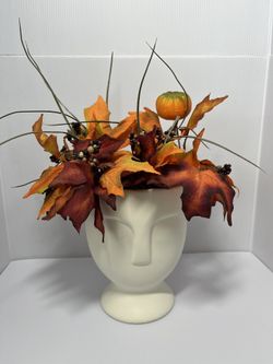 decorative fall table centerpiece featuring artificial maple leaves, berries, and a small pumpkin arranged in a white ceramic vase with a face design$10Highland, CA