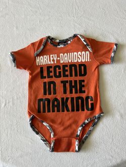 Harley-Davidson baby boy's romper is a cotton bodysuit featuring a motorcycle-themed design with "Legend in the Making$5San Bernardino, CA