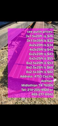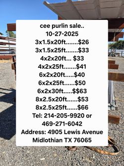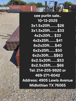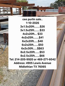 New 3x1.5x20ft Cee Purlins $26Dallas, TX