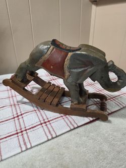 WOODEN TOY ROCKING ELEPHANT VINTAGE HAND PAINTED DECOR TRUNK UP 9”