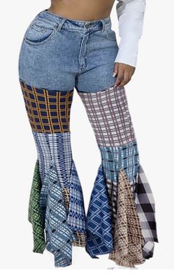 Women High Waist Patchwork Flare Jeans Plaid Bell Bottom $25Greenbelt, MD
