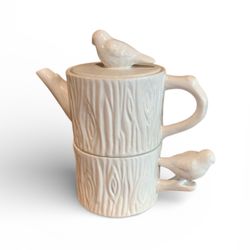 Bird Tea Set For One Stackable Chickadee Woodgrain Ceramic White Twos Company Vintage Teacup Teapot$25Tualatin, OR