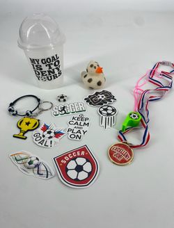 brand New Pre-Owned Soccer Goodies Set in Cup Stickers, Whistle, Ducky, Medal.$5Fontana, CA