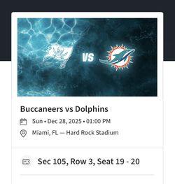 Dolphins vs. Buccaneers - 2 Tickets$400Laud Lakes, FL