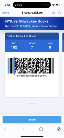 Knicks vs bucks Dec 23 Section 102 Row 7$600New York, NY