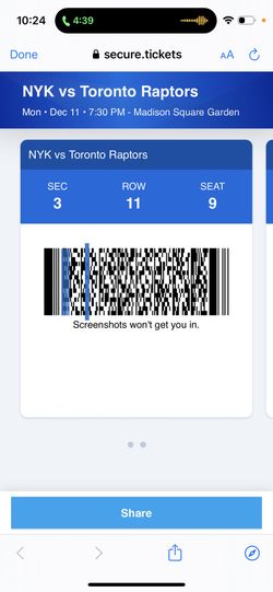 Knicks vs Raptors 12/11 Section 3 Row 11$500New York, NY