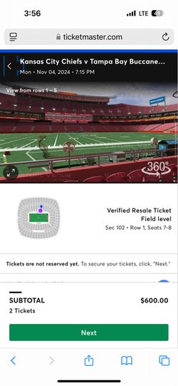 Kansas City Chiefs Vs TAMPA BAY BUCCANERS SECTION 102 Row 1$450Kansas City, MO