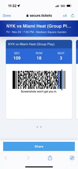Knicks vs Miami 11/24 In Season Tournament Game Section 109 Row 18$500New York, NY