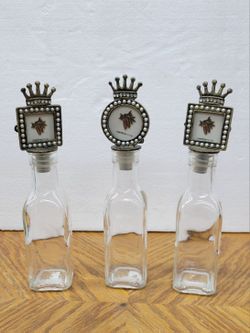 3 Decorative Glass Oil and Vnegar Bottles Featuring Crown-Topped Stoppers With decorative Frames$8Houston, TX