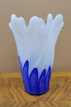 Mouthblown in Italy, Vietri Onda Glass Cobalt and White Medium Vase.