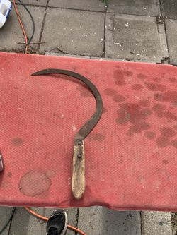The item pictured is a vintage or antique hand sickle (also known as a grass hook or small scythe). It is a traditional gardening and farm tool used $15Plano, TX