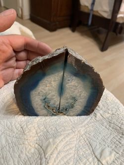 This is a pair of polished blue agate geode bookends, likely made from Brazilian agate and dyed blue. $50Plano, TX
