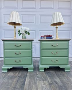 🌺 Newly Refinished Quality Solid Wood Nightstands/ Sage Green/ Details Below ⬇️/ I Can Deliver $285Orlando, FL