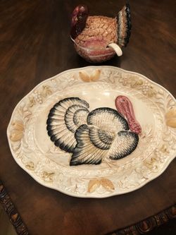 Beautiful Ceramic Set For Thanksgiving Oval Turkey Platter And Gravy Dish With A Spoon $40Hightstown, NJ