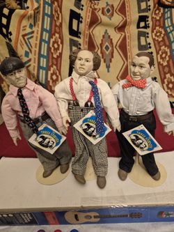 THREE STOOGES UNUSED VINTAGE COLLECTION/ 3 DOLLS MOE, LARRY & CURLY WITH DOLL STANDS/ PLATE WITH CONTAINER/3 GOLF BALLS, SHOT GLASS, 3 DAUBERS/2 PICTU$300Hingham, MA