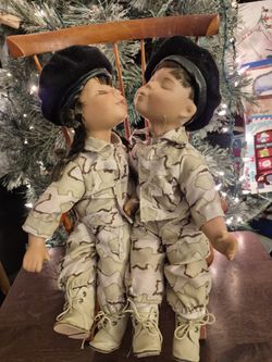 BOY & GIRL ARMY PORCELAIN KISSING DOLLS WITH ROCKING CHAIR ( VERY RARE)REASONABLE OFFERS WELCOME $200Weymouth, MA