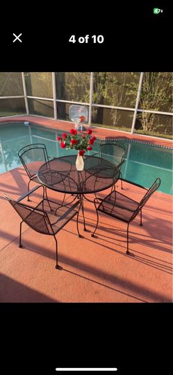 5 Piece Black Wrought Iron Vintage Patio Table With Umbrella Space With 4 Arm Dining Chairs Set$225Kissimmee, FL