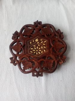 MID-CENTURY TRIVET HARDWOOD 6.5" Wide, Tri-Footed, Six-Sided, Hand Carved Leaves & Inlay with Floral Design Made in India Excellent Condition VINTAGE$25North Miami Beach, FL