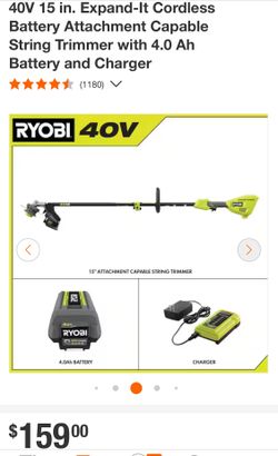 RYOBI 40V 15 in. Expand-It Cordless Battery Attachment Capable String Trimmer with 4.0 Ah Battery and Charger$130Rialto, CA
