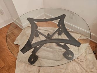 Vintage wrought‑iron coffee table with round glass top — James Hill & Co. label$500Portland, OR