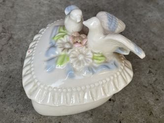Vintage Porcelain Heart Shaped Trinket Box with 2 Birds,Nest and Flowers 4"W$15Woodland, WA